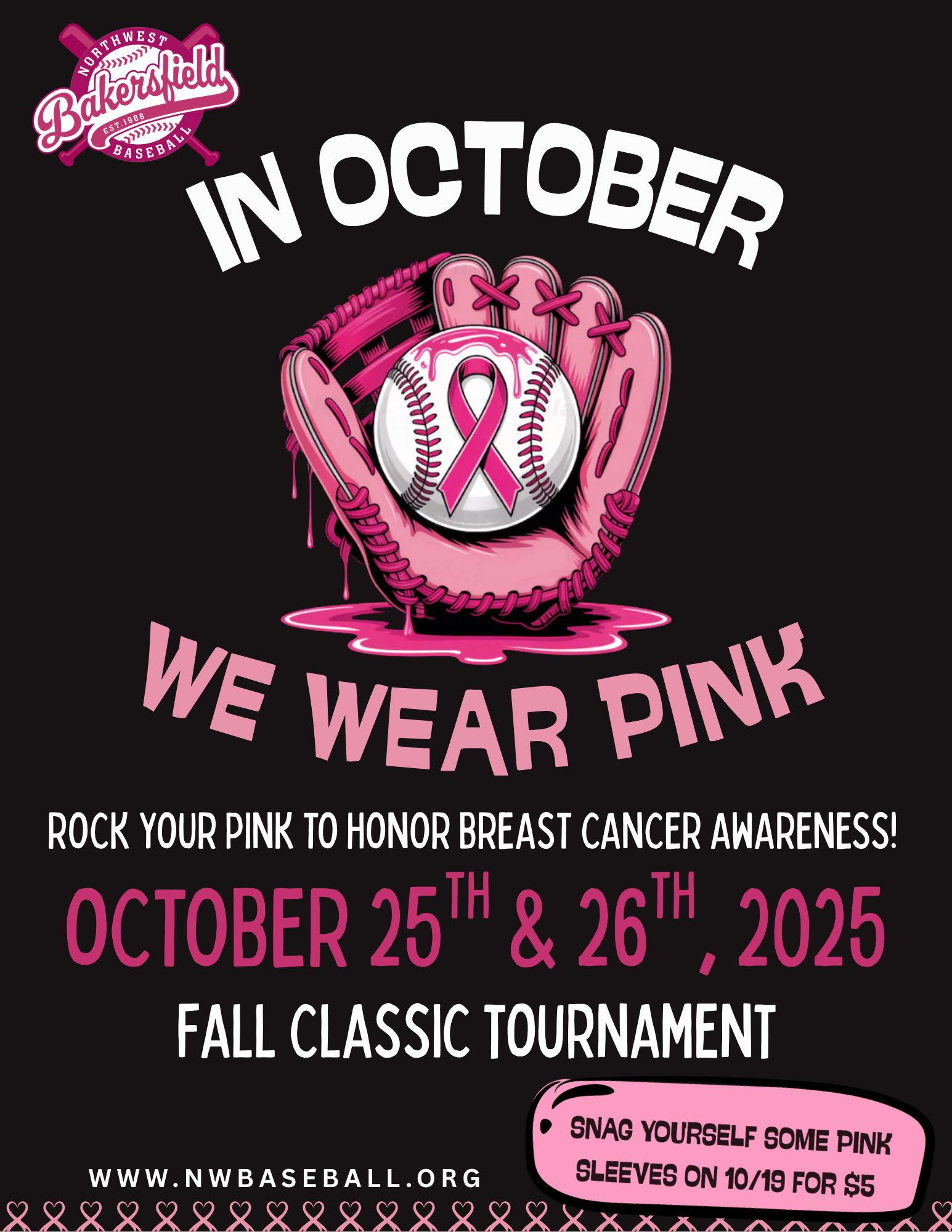 Join Northwest Bakersfield Baseball as we honor Breast Cancer Awareness Month with our annual Fall Classic Tournament!